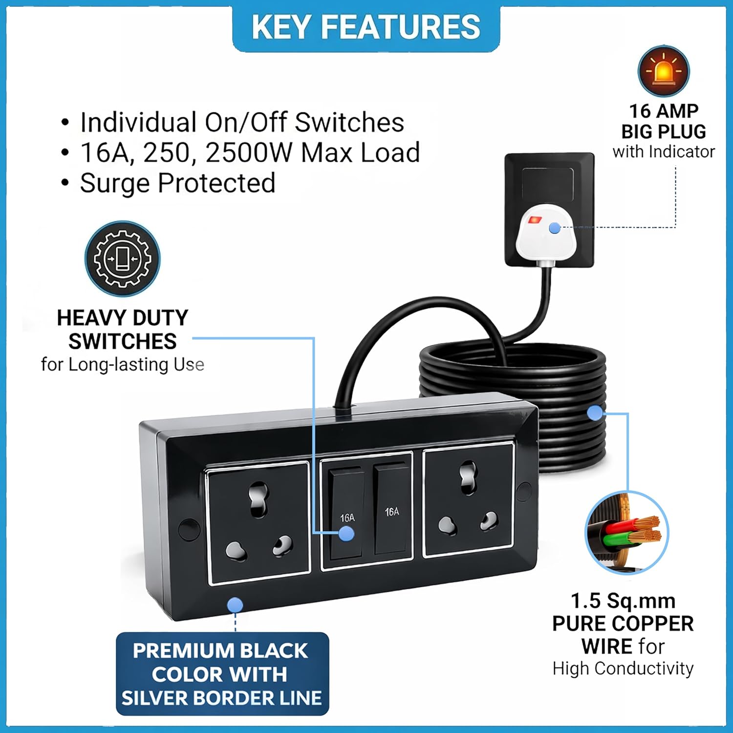 BUILT FOR HIGH-LOAD APPLIANCES: Dual 16 amp socket design on this power plug extension board handles demanding devices with confidence, offering safer distribution than a basic 15 amps extension board and reducing the risk of overload in busy home or office setups.