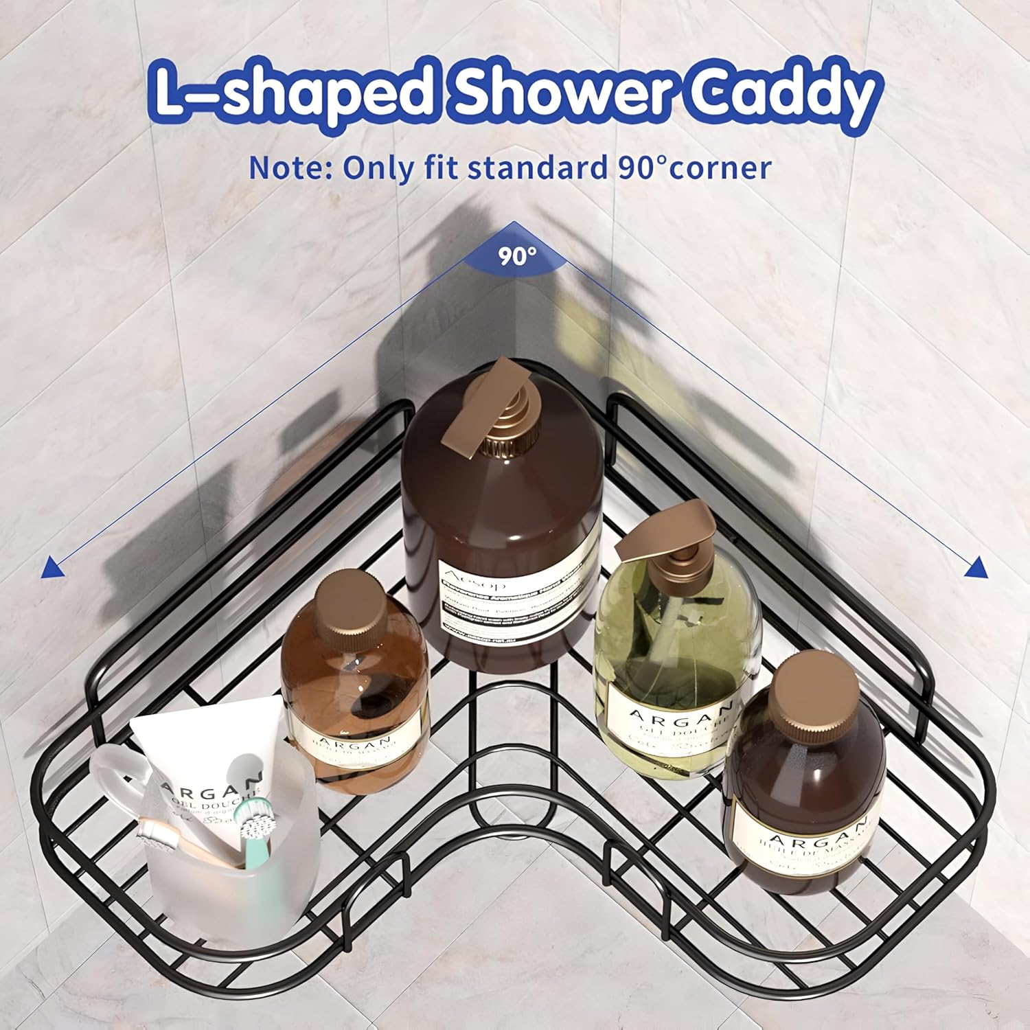 Stronger Adhesive for Easy Installation,No Drilling:Installation only takes a few minutes, requiring no drilling holes or any tools and doing no damage to the wall. Clean the surface, stick the adhesives to the wall, and hang the shower shelves to use. Suitable for smooth surfaces like tiles/marble/glass/metal, but not for uneven surfaces like painted walls.