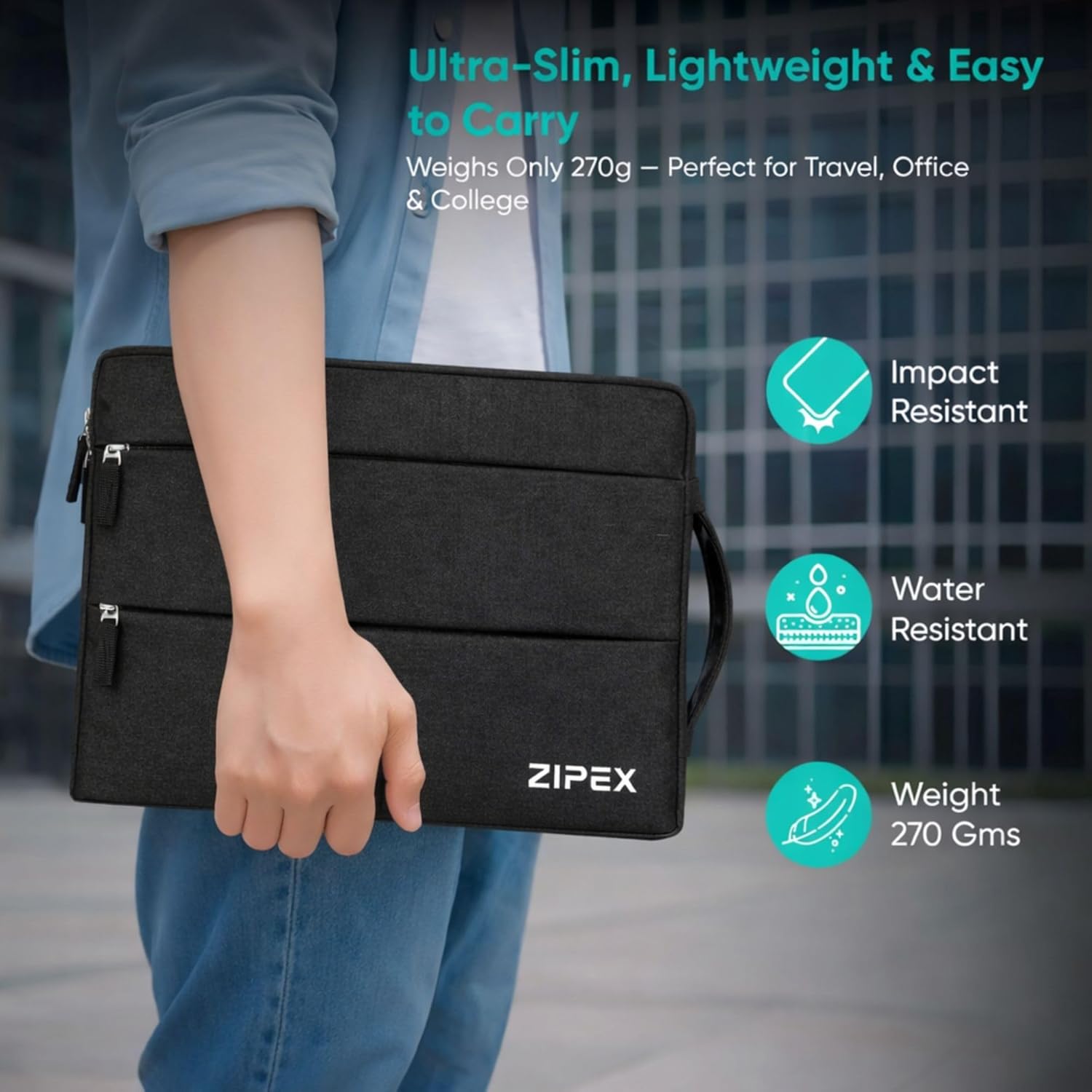 ZIPEX laptop sleeve is crafted with premium water-resistant fabric to safeguard your laptop from spills, rain, and everyday moisture during travel or office use.