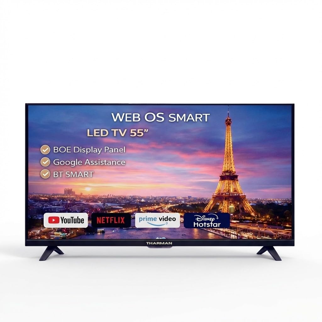 Bring cinema-like entertainment home with the THARMAN 55 Inch WebOS Smart LED TV. Featuring a premium BOE IPS display with stunning 4K Ultra HD 3840×2160 resolution and a wide 178° viewing angle, it delivers sharp, vibrant, and lifelike visuals. Powered by WebOS, enjoy seamless access to YouTube, Netflix, Prime Video, and Disney+ Hotstar. Built-in Wi-Fi, Bluetooth (BT Smart), Compatible with Google Assistant, and Magic Remote make navigation effortless. Dual 12W speakers provide clear, powerful sound. With extensive connectivity including 4 HDMI, 2 USB, AV, Optical Out, Earphone Jack, and RJ45 LAN, this TV is perfect for immersive, smart entertainment in modern living rooms.