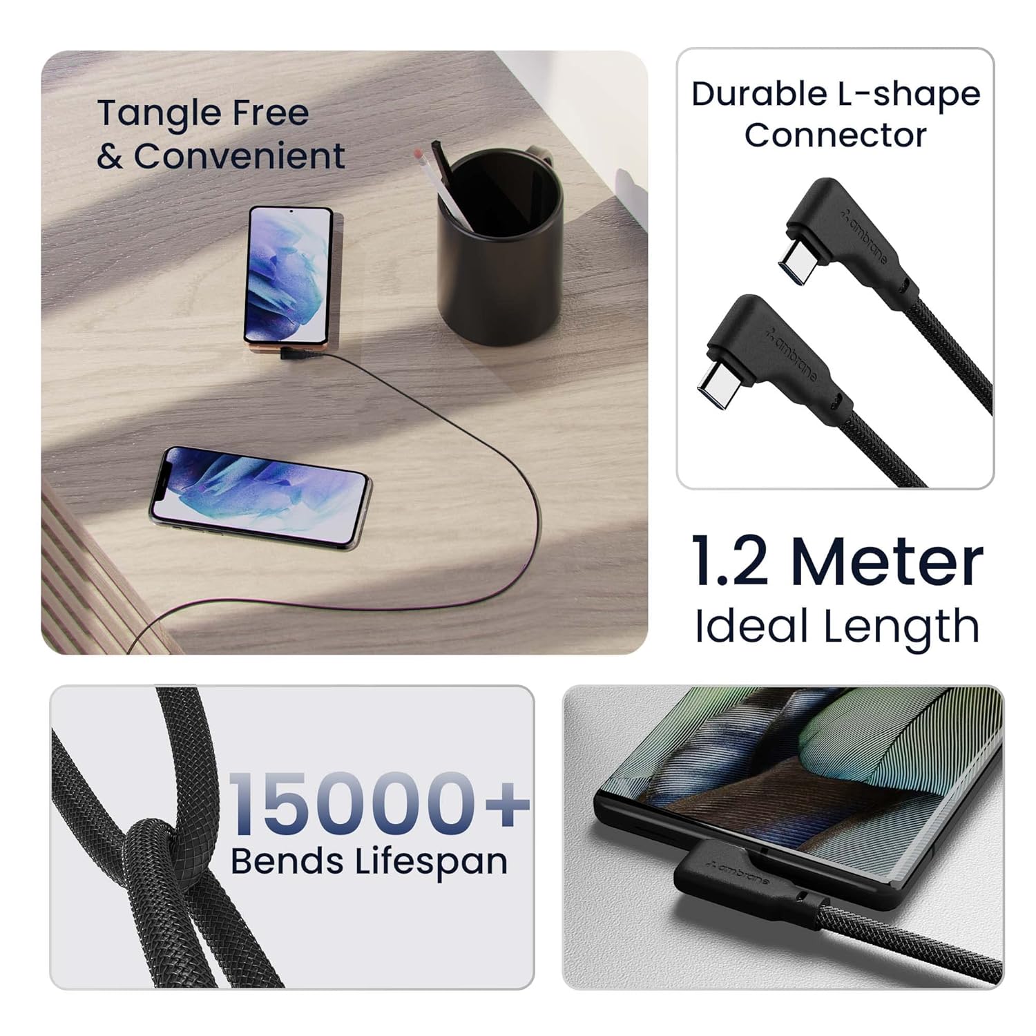 Ambrane 60W Type C Fast Charging Cable, L Shape for Easy Holding, PD Technology, 480Mbps Data Sync for Smartphones, Laptops & Other Devices, 1.2m (ABTTLS-12 Black)