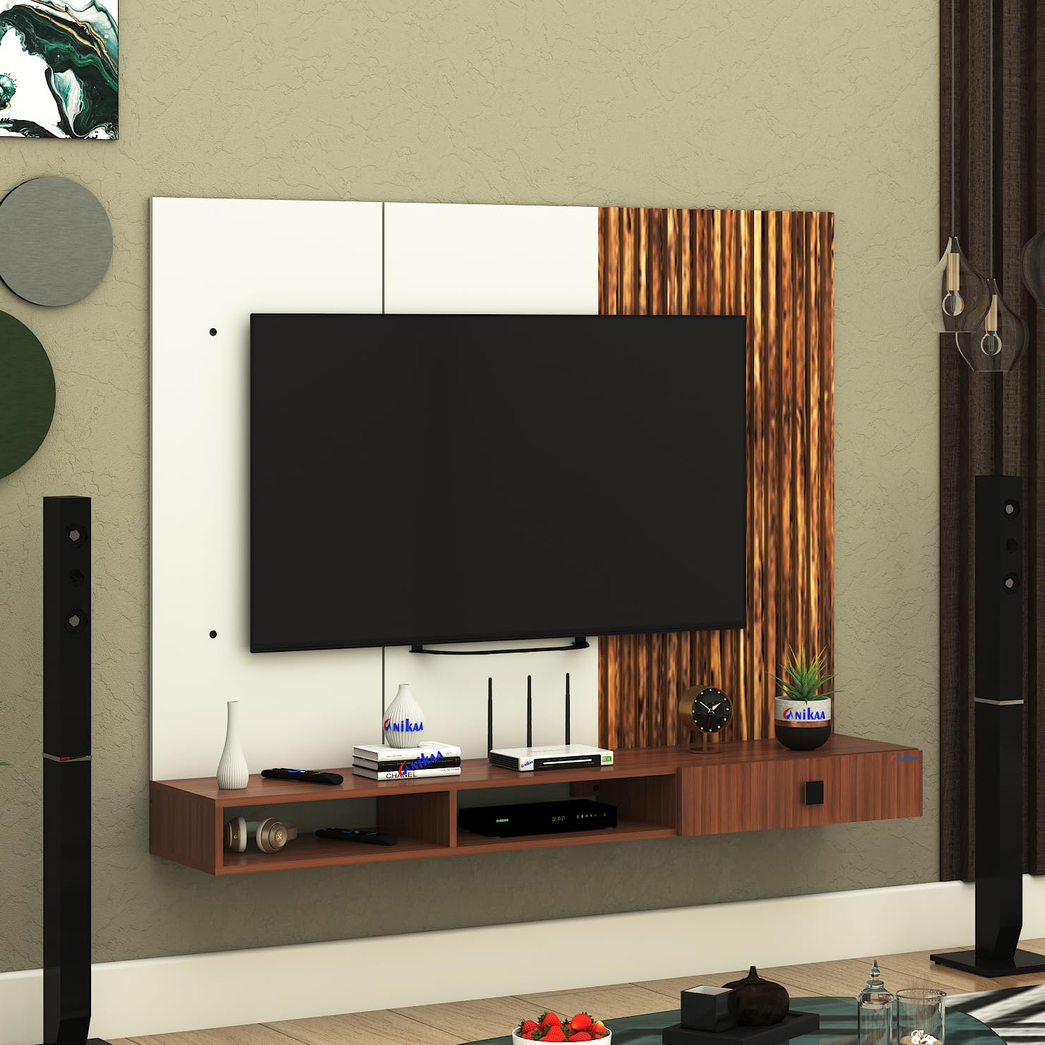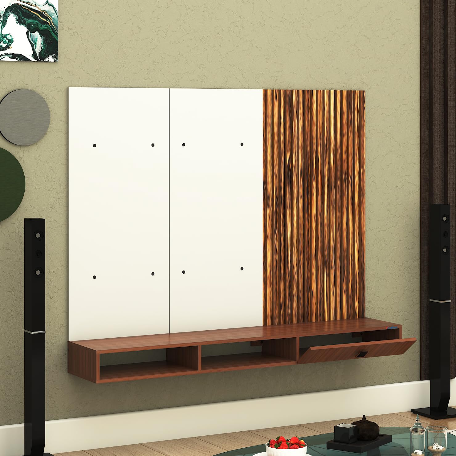 Constructed with engineered wood in a Walnut and White matte finish, this entertainment unit is designed to accommodate TVs up to 60 inches. Its sleek floating design features a closed cabinet box, display shelves, and open compartments to organize all your gadgets ? from set-top boxes and routers to speakers and dcor items.
