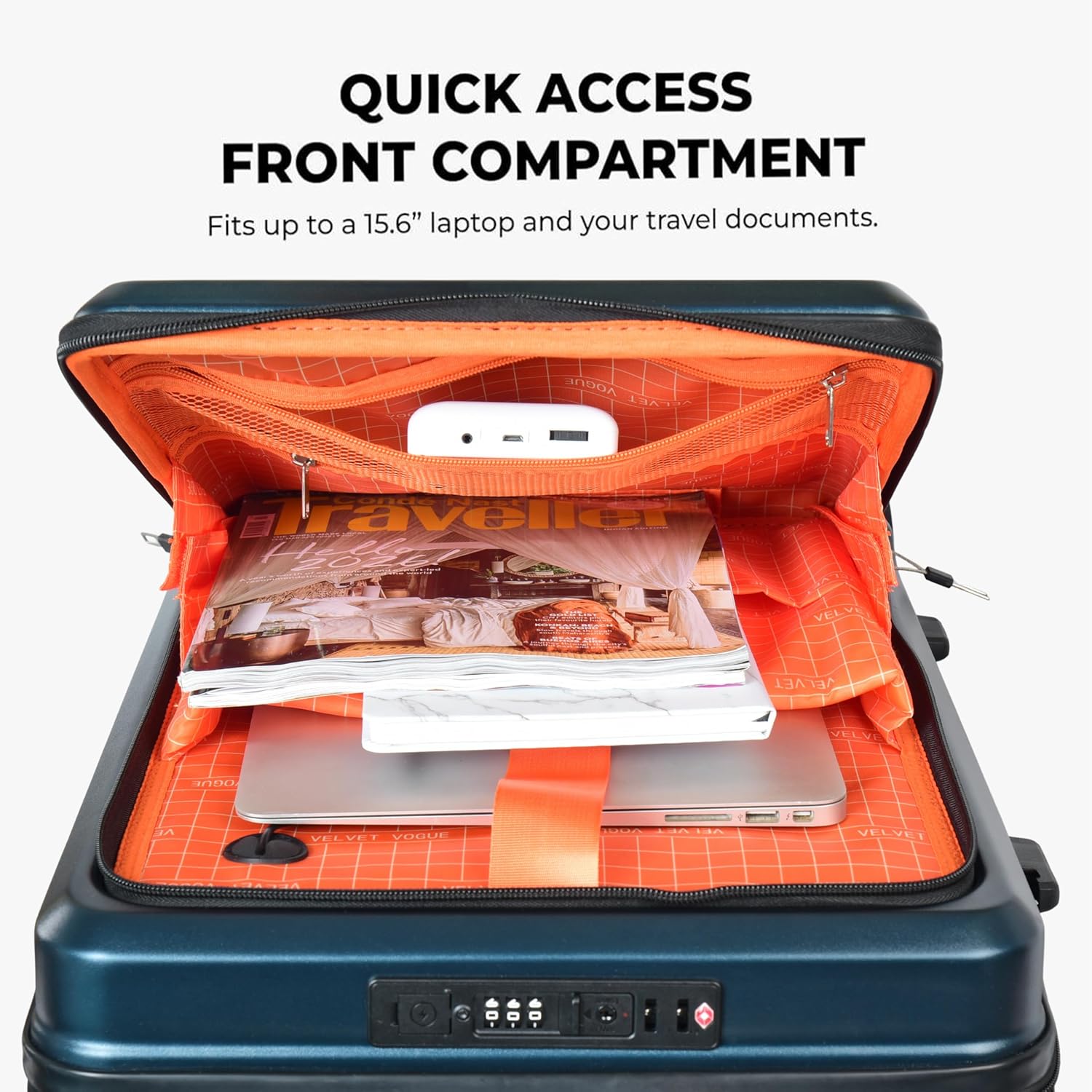 Smart Front Laptop Compartment for Quick Access: Travel smarter with a quick-access front compartment for a 15.6″ laptop, tablet, documents, and accessories. Padded for protection and easy to access during security checks, it keeps essentials organized without opening the main luggage—perfect for professionals on the go.