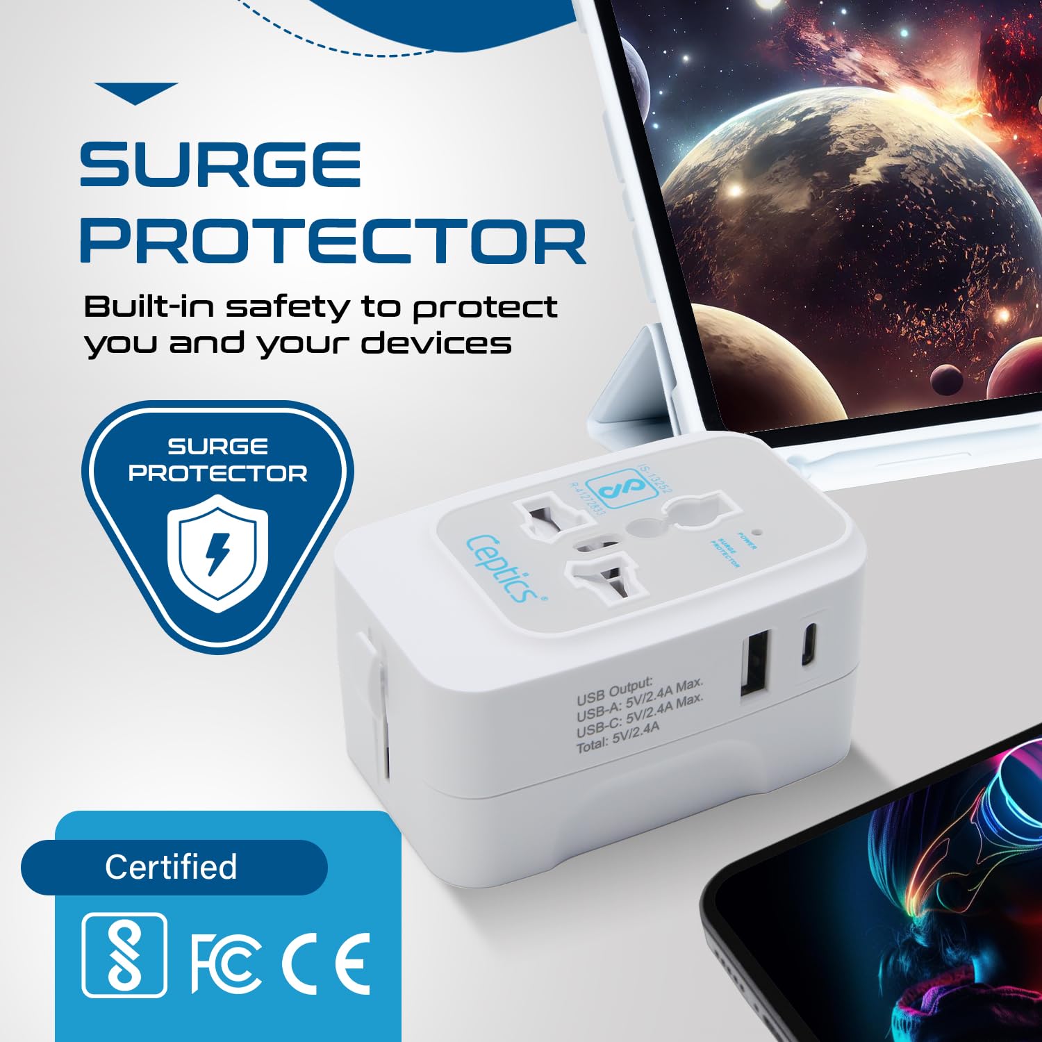 SAFETY CERTIFIED – The Ceptics travel adapter international in one has Fcc CE RoHS certified safety system Surge protection children’s electric shock protection plug Lock and built-in safety to protect you and your devices