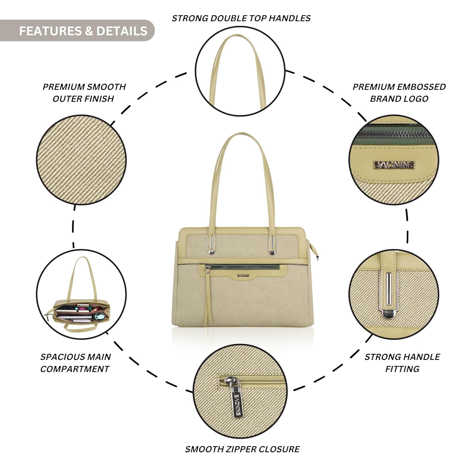 The BAGNINE Designer Laptop Bag for Women is thoughtfully designed to combine professional elegance with everyday practicality. Made from premium textured faux leather, this laptop tote offers a sophisticated appearance that complements modern workwear. The structured silhouette and refined finish make it a stylish accessory suitable for office environments, meetings, and business travel. The spacious interior allows you to comfortably carry your laptop along with documents, notebooks, chargers, and other work essentials. A convenient front zip pocket provides quick access to frequently used items such as your phone, keys, or cards. The secure zipper closure ensures your belongings remain protected while keeping everything organized throughout the day. Designed with sturdy dual top handles, the bag offers comfortable carrying whether you are commuting to work or traveling for meetings. Its combination of elegance, functionality, and practical storage makes it a reliable everyday office bag. Whether heading to the workplace, attending meetings, or traveling for business, the BAGNINE laptop bag is the perfect blend of style and convenience.