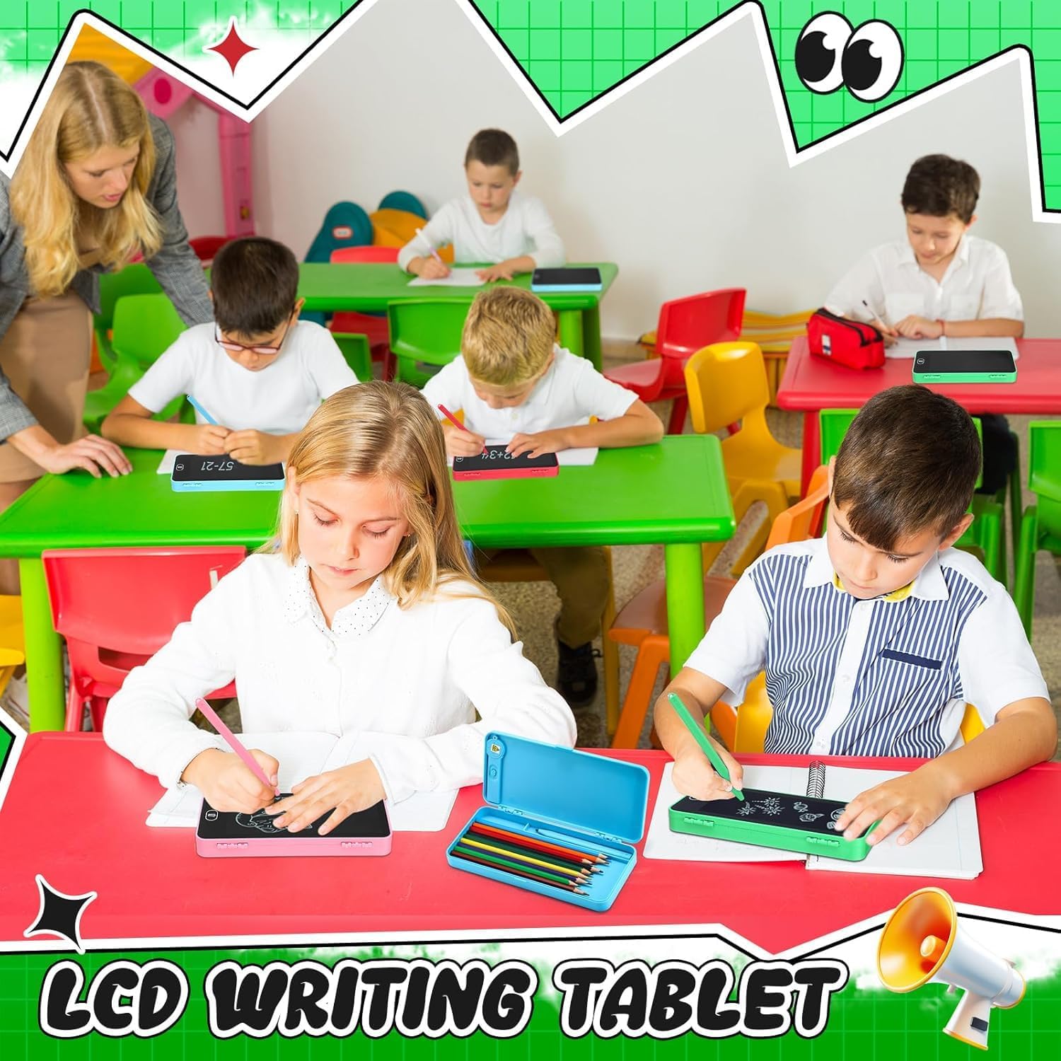 Multi-Functional Design: Combines an LCD writing tablet with a pencil box, providing both a reusable drawing surface and storage compartments for stationery items like pens, pencils, erasers, and other school supplies