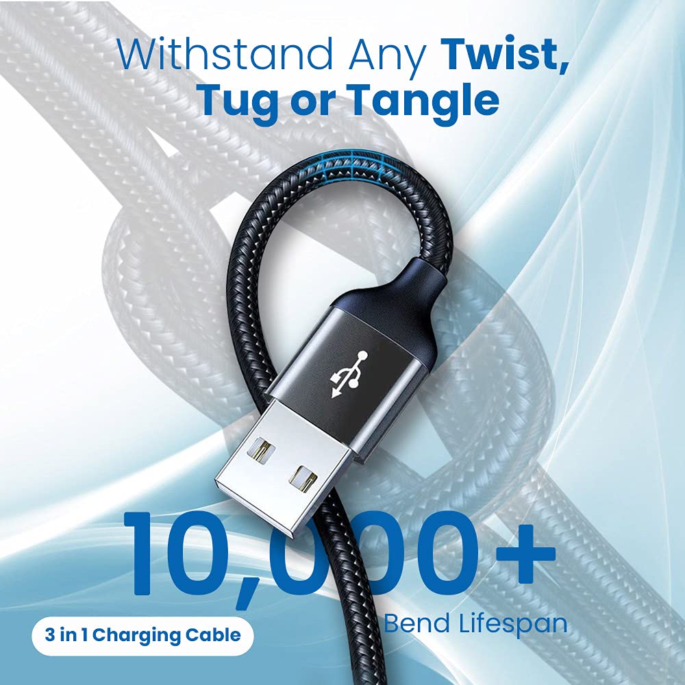 Extended Length 1.2 meter long 3 in 1 charging cable use nylon material to protect the wire and avoid knots. This cable is unique in terms of design and multi-use to provide the best comfort and performance while using.