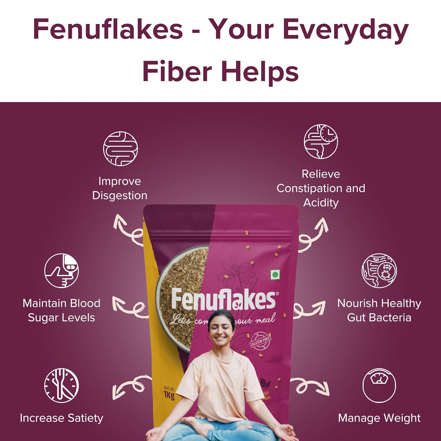 BENEFITS OF FENUFLAKES : Fiber helps improve digestion, promote satiety. Protein is essential for building and repairing tissues, maintaining muscle mass, and supporting healthy immune function.