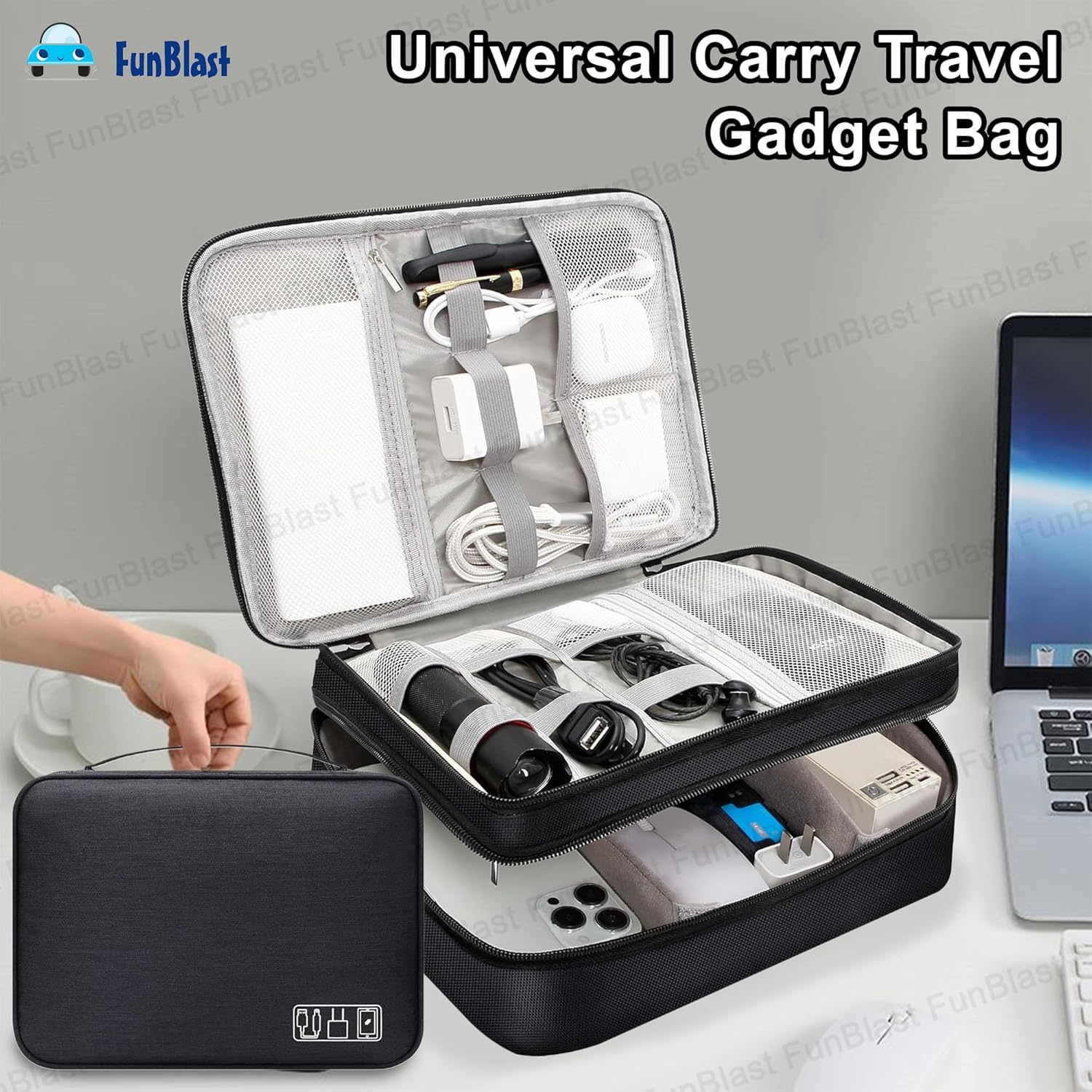 Content – 1 Pcs FunBlast Electronics Accessories Organizer Bag, Universal Carry Travel Gadget Bag, Double Layer Travel Cable Organizer Bag. Dimension: 24.5 X 18.5 X 10 CmDouble Layers & Organized -This travel electronics organizer bag is designed with two separate layers, multiple mesh pockets and various size of elastic bands providing great flexibility for organizing electronics accessories. Plenty of pockets suit for Cables, Cord, Chargers, Hard Drive, Flash Drive, SD Card, Phone. Keep all your gears easily found.Waterproof & Protected -This cable organizer bag is made of quality and durable cation fabric, the front pocket is made of PU leather & Oxford Polyester, water and scratch-resistant, Padded foam and elastic bands, protects electronics accessories from dust, shock, and moisture.DIY & Large Capacity – This travel cord organizer bag has 4 removable padded dividers to protect items inside from scratches, impact and accidental falling. You can design the layout as you wish to keep all your electronic travel accessories in perfect order.Convenient & Portable – The electronics travel organizer is perfect for Business, Traveling, School, Camping, Home. Its perfect size allows it to be easily put into your backpack and luggage. This cord organizer will be a perfect helper while you are on travel or business trip.