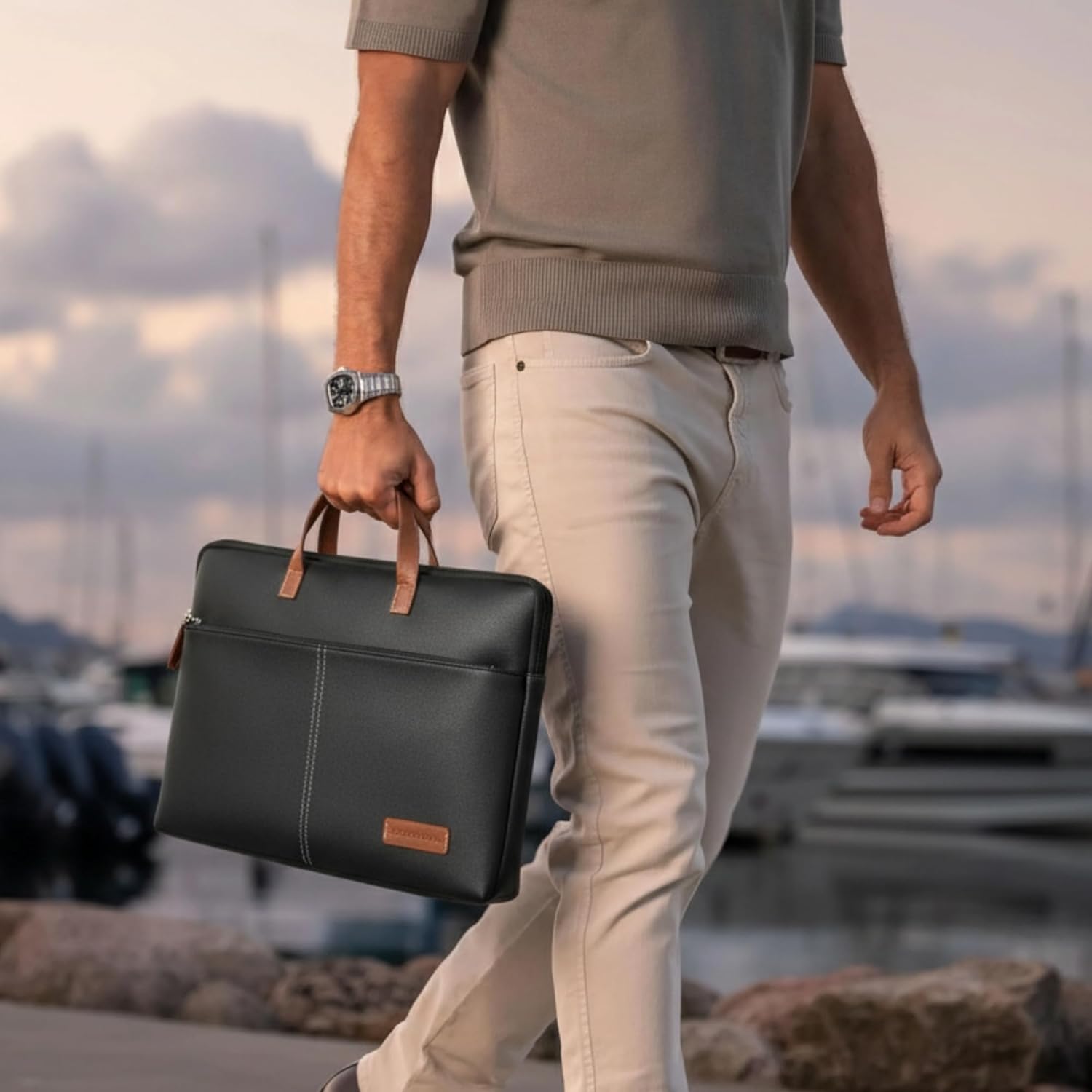 The Giordano professional laptop sleeve is the perfect blend of sophisticated style and practical design. Crafted from high-quality PU leather, this slim-fit sleeve is both durable and stylish, making it an ideal accessory for the modern professional. The color-block design features a smooth body with contrasting brown accents on the handles, zippers, and the brand logo, creating a polished and elegant look. Designed with functionality in mind, the sleeve offers a spacious main compartment with a smooth single-way zipper to securely hold your 15-inch laptop. With external dimensions of L-39 cm, H-28 cm, and W-4 cm, and weighing a mere 320 grams, it provides excellent protection without the bulk. An additional long zippered pocket on the front provides convenient storage for accessories like your charger, mouse, or documents. The back of the sleeve is equipped with a trolley strap, allowing you to easily slide it over the handle of your luggage for effortless travel. Sturdy white stitching throughout the bag adds a touch of classic detail and reinforces its robust construction. This unisex laptop sleeve is a versatile and essential accessory for anyone who needs to carry their device with confidence and style.