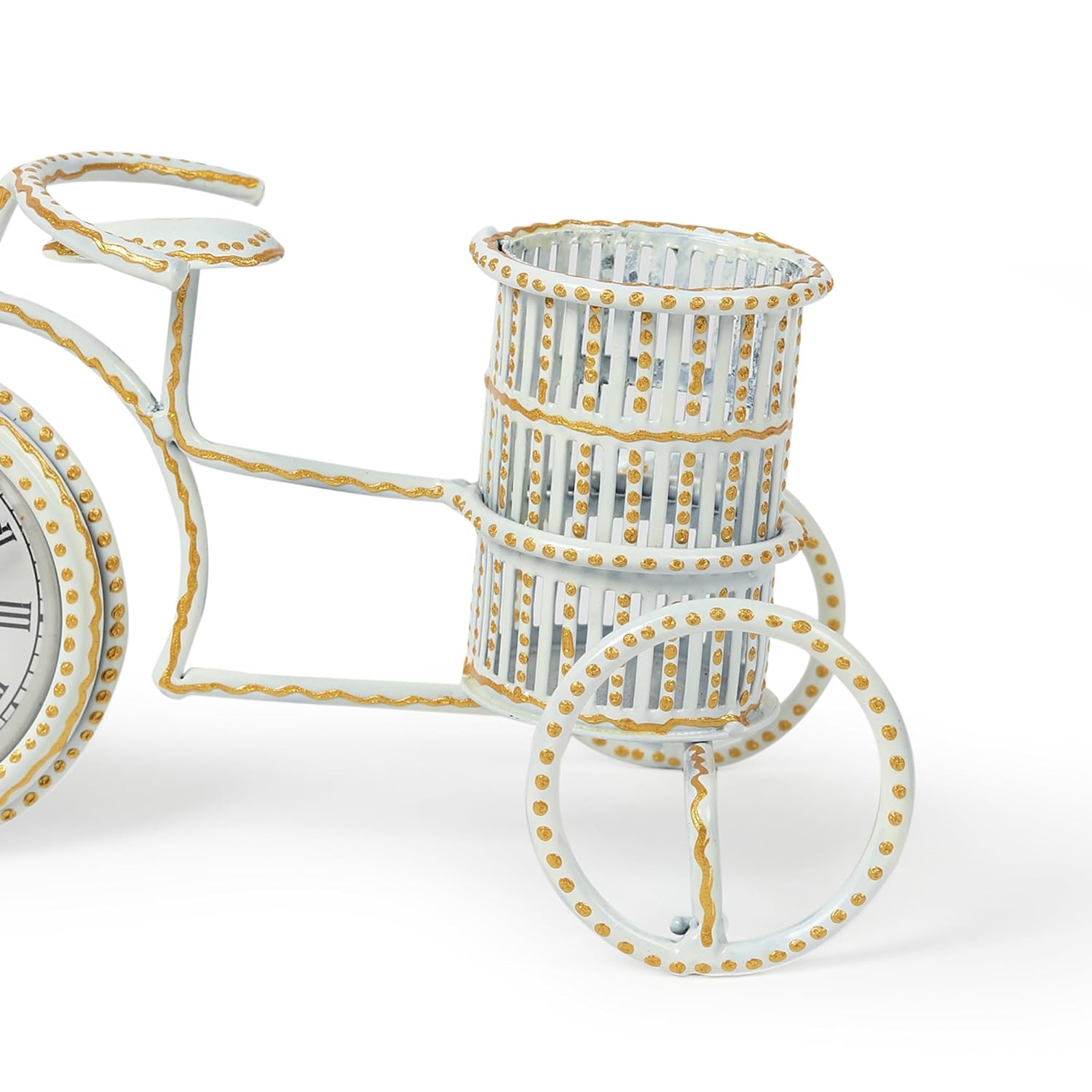 Elevate your interior spaces with this regal metal cycle pen and pencil holder and table clock, perfect for organising your desk with elegance. Handcrafted with intricate details, this stunning piece captures the grandeur and opulence of Indian culture. The vibrant colours and meticulous craftsmanship make it a true work of art, perfect for adorning your living room, bedroom, or any other space in need of a touch of elegance. This metal wall decor is a statement piece that will instantly draw the eye and become a conversation starter.
