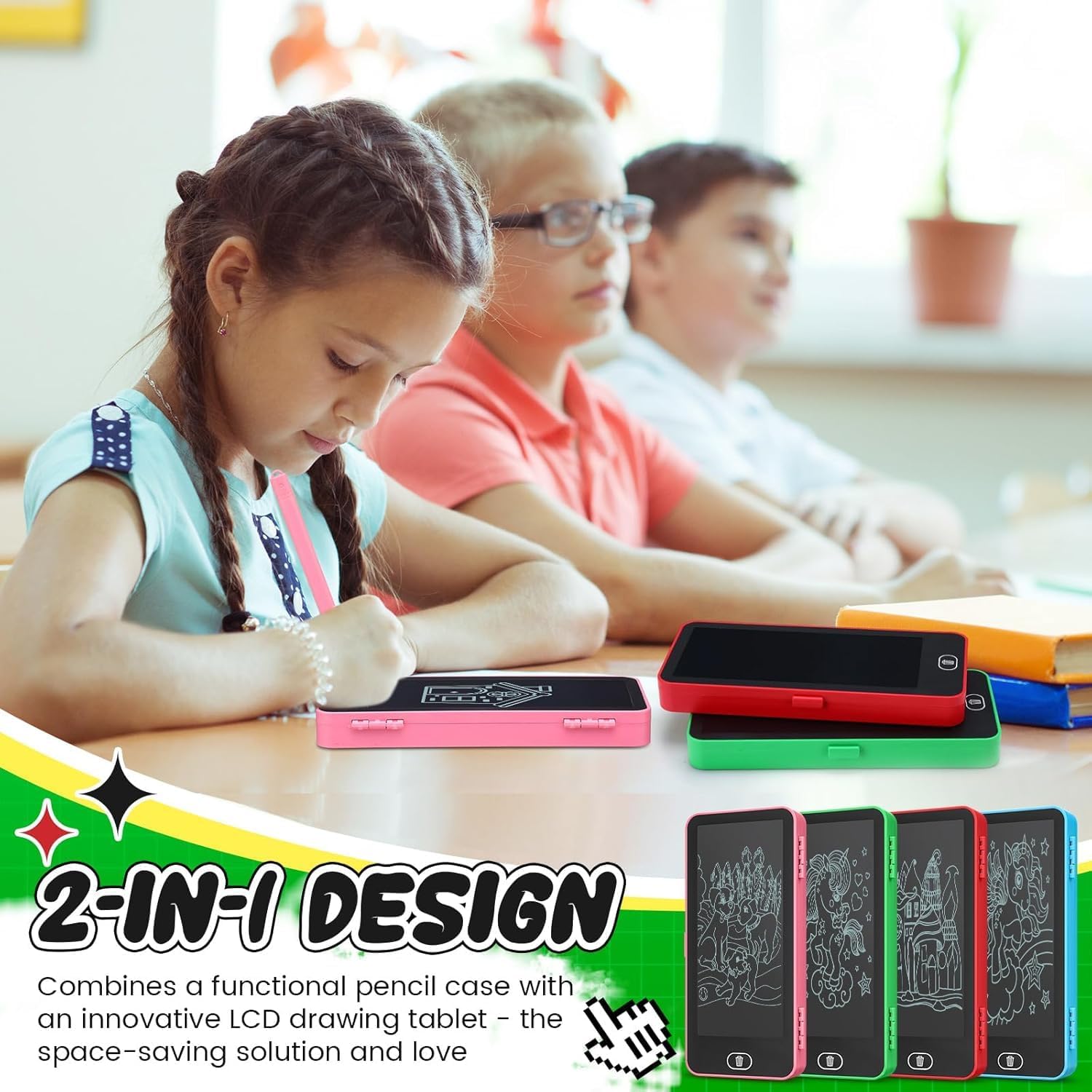 2-in-1 Design: Combines a spacious pencil box with an interactive LCD writing tablet, making it perfect for both studying and creative drawing activities.