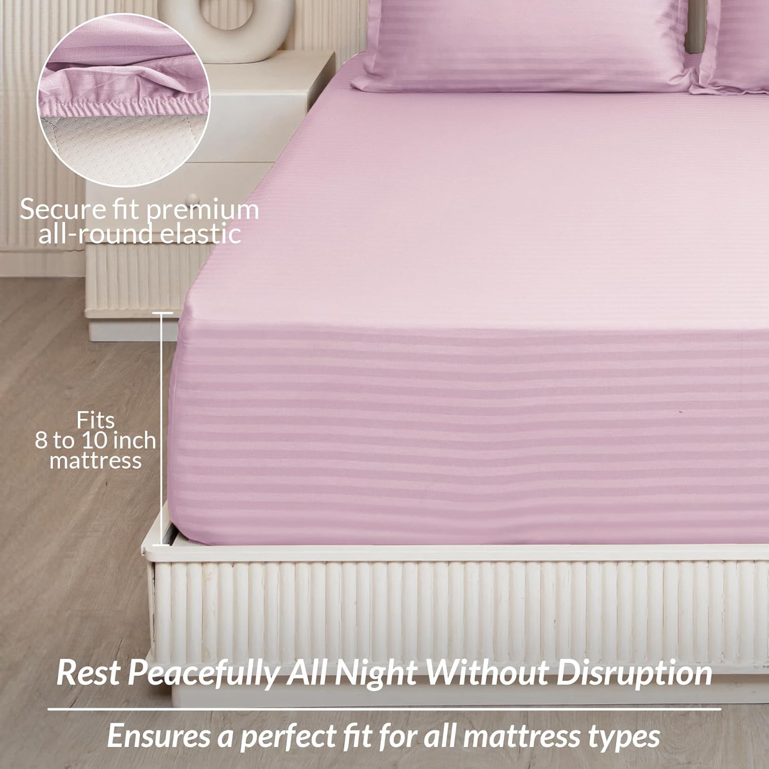 HOMEMONDE Fitted Bedsheet with All Around Elastic 210 TC Cotton Satin Stripes Wrinkle Free 78 x 72 Inch Double Bed Fitted Sheets with 2 Pillow Cases, Pink | Perfect for Home Decor & Gifting
