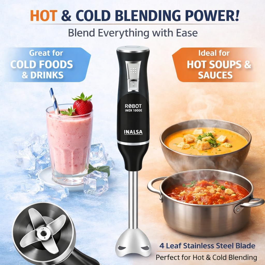 MOST POWERFUL HAND BLENDER IN INDIA: INALSA Hand blender 1000 watts is the most powerful hand blender in India as of now. With power of 1000W, the appliance is efficient and effective at its job of blending and mixing ingredients whether you are making meringues, mayonnaise, baby food, salads, omelet mixes or batters for baking.