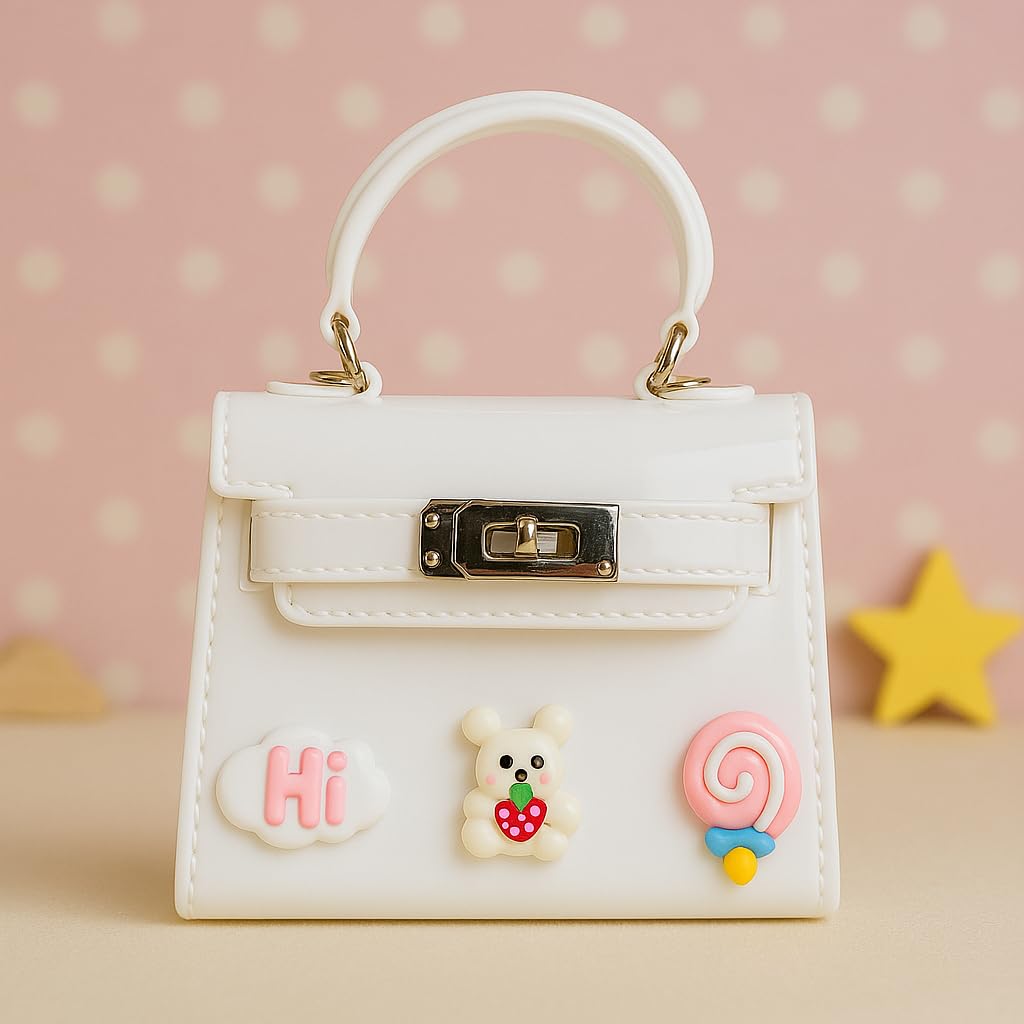 Add a touch of sparkle and charm to your little one’s look with this adorable mini kids purse! Crafted in a stylish trapezoid shape, this glossy handbag is perfect for toddlers and young children who love to accessorize. It features a top handle and a silver chain strap for crossbody or shoulder wear. The fun 3D embellishments—a sweet bear, cheerful “Hi” cloud, and a candy lollipop—make this bag irresistible. Whether for dress-up, playdates, or as a thoughtful gift, this mini purse blends fun and functionality with a secure turn-lock closure that’s easy for tiny hands to use.