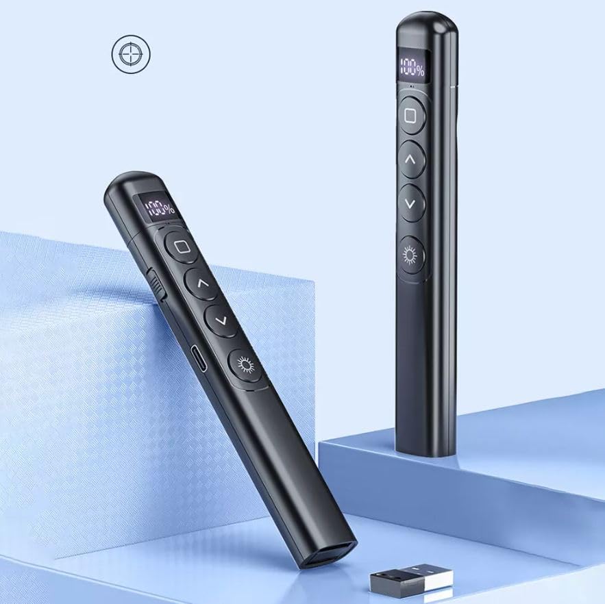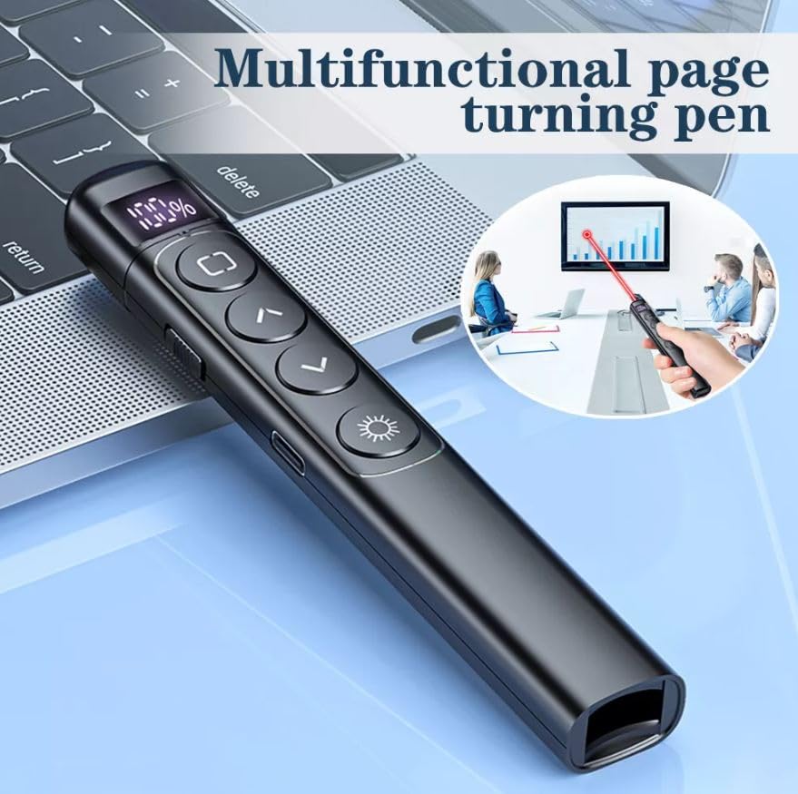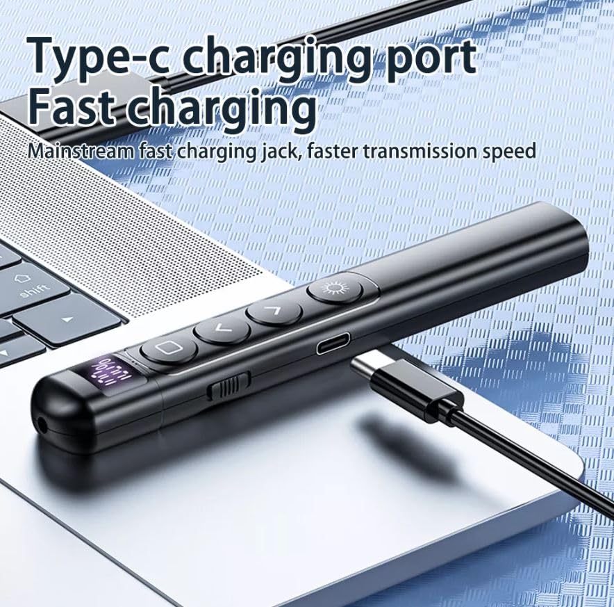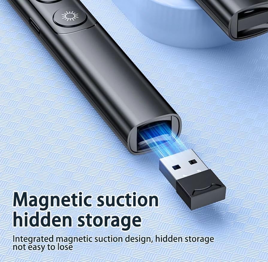 (Easy to Use and Carry) The wireless presenter remote is plug & play device without installing any software. Just put in an AAA battery (included in the package), fetch the receiver, and plug it into your devices. USB receiver can be magnetically stored inside the bottom of presentation clicker. Like a pen, this presentation pointer can be clipped to your pocket or book.
