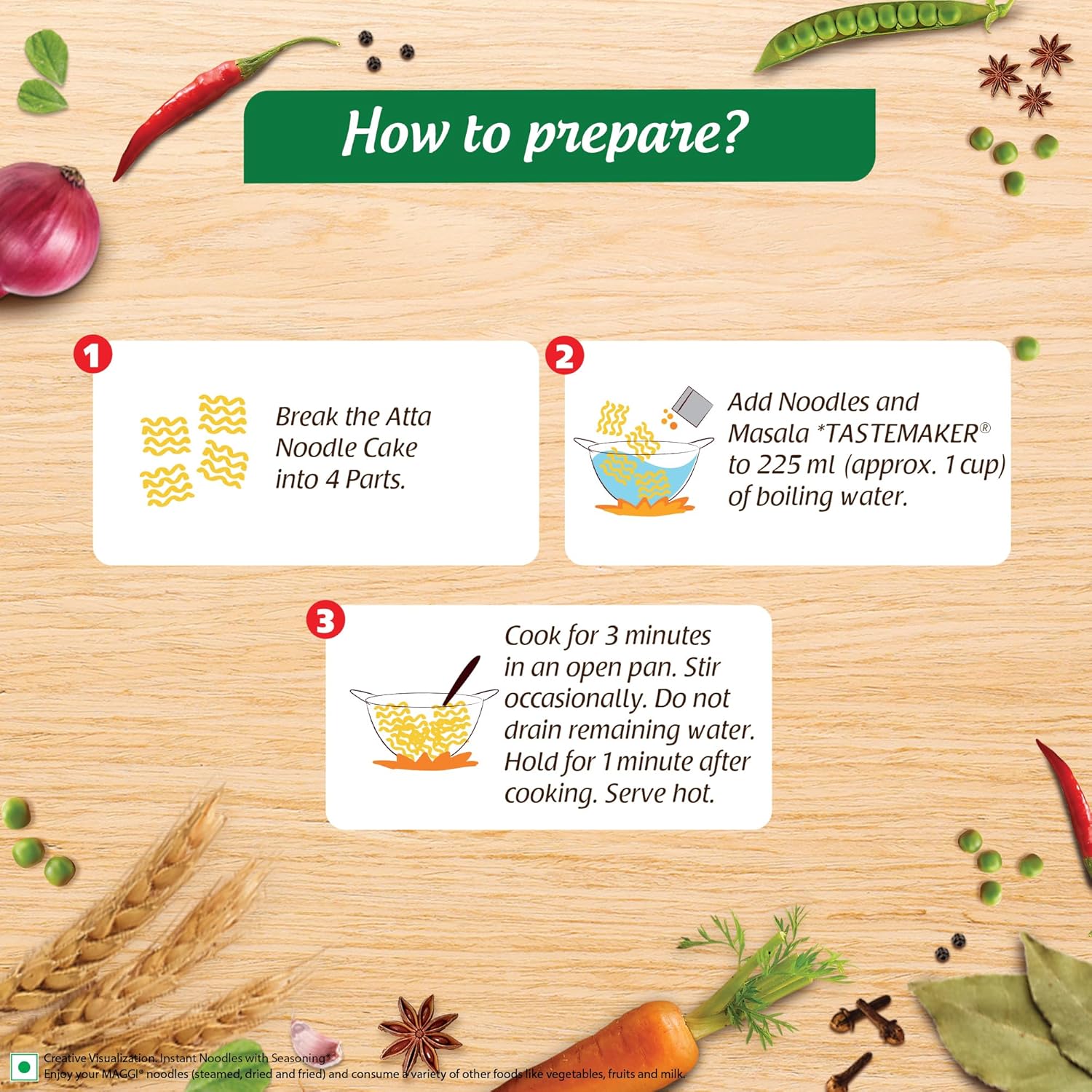 MAGGI Nutri-Licious Masala Veg Atta Noodles with appetizing aroma and delicious masala taste made using 20 Spices and Herbs. These masalas are roasted to perfection (Refer to pack for more details) for an aroma flavour which you will love. These MAGGI Nutri-Licious Masala Veg Atta Noodles are truly a good combination of delicious and nutritious Wheat Flour (Atta), Colorful Vegetables 20 Spices Herbs. Also, loaded with the goodness of whole wheat, each meal is deliciously filling. Each serve (72.5g) of the MAGGI Masala Veg Atta Noodles is a Source of Fibre Iron (Refer to pack for more details). Usage: Break the noodle cake into 4 parts. Add Noodles and Tastemaker to 225 ml (1 teacups) of boiling water. Cook for 3 minutes in an open pan. Stir occasionally. Do not drain the remaining water. Hold for 1 minute after cooking. Serve hot. Storage Instructions: Store in a cool, dry, and hygienic place to protect from insects, pests, and strong odours.