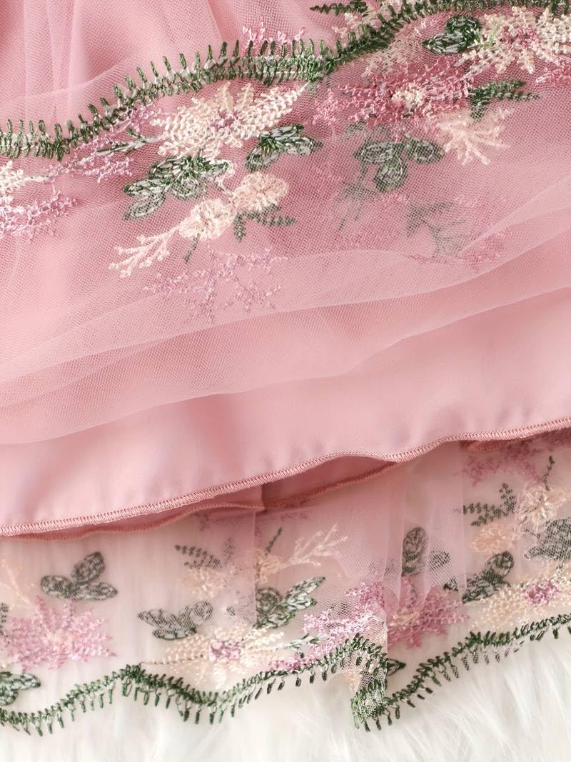 PAMBERSTON Girl’s Floral Pattern Embroidered Polyester Blend Tulle Dress with Round Neck Long Sleeve Knee Length and A-Line Style