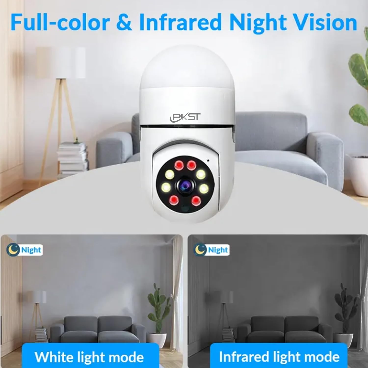 PKST :- Plug in Security Cameras,Home Security Camera with Mobile App, Smart Security Camera, Mini Surveillance Baby Camera,WiFi Camera for Office Indoor with IR Night Vision, 2-Way Audio, Motion Detection The configuration of this home camera is easy installation,the home camera can be mounted the living room, kitchen, bedroom, office and other indoor places.The smart camera also easy to connect with your phone, you can scan the QR-Code(which is on package) to download the application, or download on App store.Not only can you manage multiple home security cameras with one account, but you can also share one wifi home security camera with multiple accounts. REMOTE VIEWING :Our camera can control the viewing angle through APP, you can remotely view it anytime and anywhere through for iPhone/for Android for phone/for Ipad.This Wireless Security camera can be accessed remotely via apply to iPhone/Android phone. The WiFi camera can provide you with a clear view at any time. You can control the camera’s viewing angle through the APP to achieve 360-degree viewing without blind spots. Full HD 1080P Video: Stunning HD Video Quality 1080P Face to Face effect, High resolution live streaming delivers you a crystal clear picture with more details to know what’s going on when you’re away from home.Support record and playback with local micro SD card(up to 128G), Cloud Storage.?SD card is not included in the package? 2-WAY AUDIO & SOUND DETECTION:Wireless Security Camera Interact with your pets and family with built-in speaker and microphone. keeping you aware of what’s going on at home .If you have any question, please contact us.We provide lifetime technical support and services. EASY SET-UP: Scan QR Code to download App on App Store or Google Play. Seamlessly HD video streaming and two-way audio via your smartphone. Wired power outlet required.