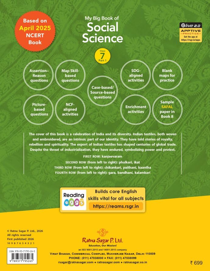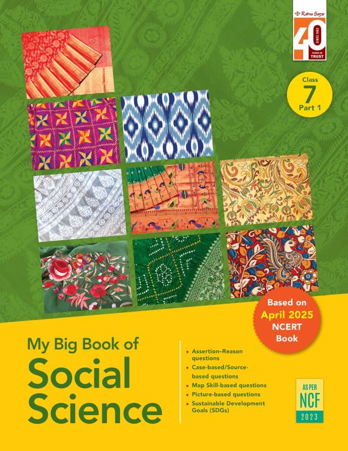 My Big Book of Social Science Class 7 Part 1 is a thoughtfully developed Social Science textbook based on the latest April 2025 NCERT curriculum and NCF 2023 guidelines. The book builds on foundational concepts and guides students towards deeper understanding, analysis, and application of social science topics. The content integrates assertion–reason questions, case-based and source-based questions to help learners develop logical reasoning and interpret evidence effectively. Map skill-based questions and blank maps for practice strengthen cartographic skills, while picture-based questions support visual learning and comprehension. NCF-aligned classroom activities promote inquiry, discussion, and experiential learning. SDG-aligned activities help students connect social science concepts with sustainability, citizenship, and global challenges. Enrichment activities further encourage curiosity and independent exploration beyond the core syllabus. The book also focuses on developing higher order thinking skills such as comparison, evaluation, and interpretation, preparing students for competency-based assessments. The language is clear and age-appropriate, making complex ideas accessible without oversimplifying them. Designed for both classroom instruction and self-study, My Big Book of Social Science Class 7 Part 1 is a reliable NCERT-aligned resource that supports conceptual clarity, exam readiness, and real-world understanding.