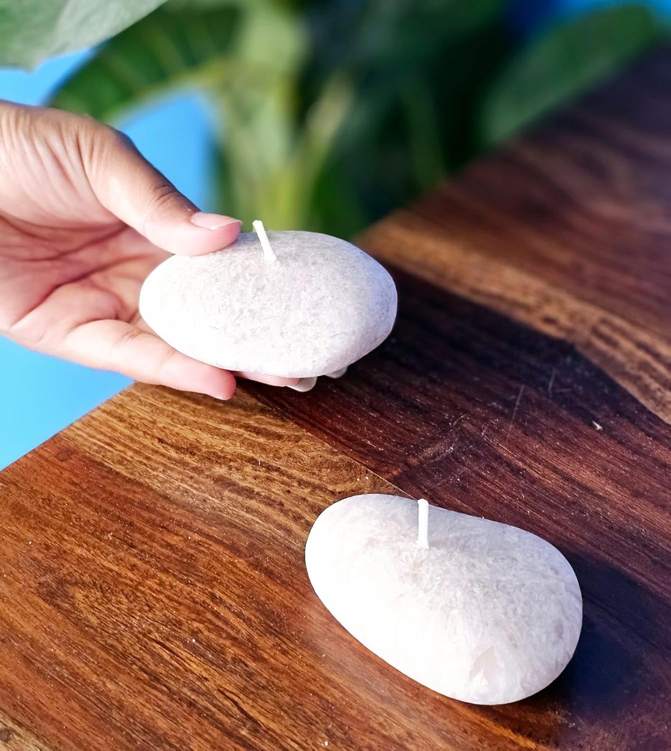 Package Includes: 2 Pcs Scented Stone-Shaped Wax Candles | Color: Grey | Material: Premium Wax | Shape: Oval Pebble | Size :