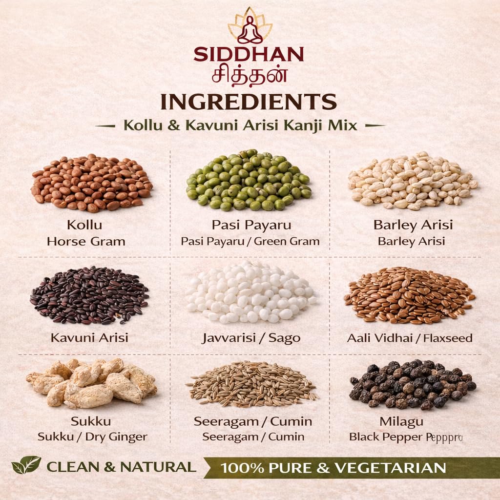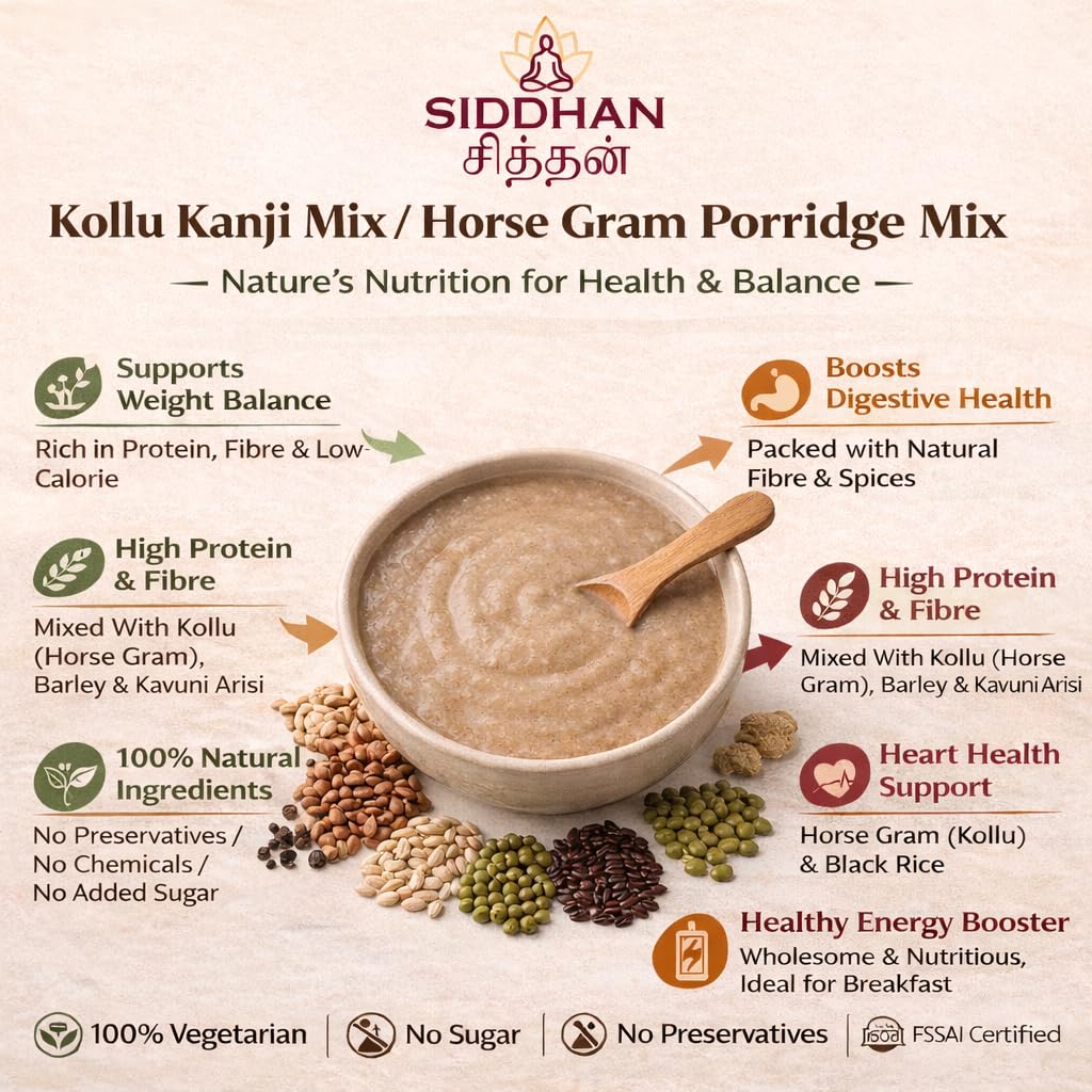 SIDDHAN Kollu & Kavuni Arisi Kanji Mix is a traditional Tamil health porridge blend made using 9 carefully selected natural ingredients. This mix combines the strength of Kollu (Horse Gram) and the goodness of Kavuni Arisi (Black Rice) with digestive spices to deliver balanced daily nutrition. The product can be consumed in both powder form (for easy digestion) and cooked kanji form (for complete nourishment). Ideal for breakfast, recovery diets, weight management and daily wellness for all age groups.