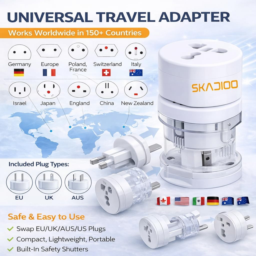 → ✔ WORLDWIDE CHARGING: One travel adapter with four plug – US/AUS/UK/EU plug, Cover North/South America, Europe, UK and AUS 150+ Countries(basically the World). Used in Canada, USA, Mexico, Brazil, Chile, Peru; UK, Germany, France, Spain, Greece, Italy, Switzerland, Ireland, Netherlands, Sweden, Norway, United Arab Emirates, Israel, Kuwait, Saudi Arabia, Turkey, Egypt, China, Russia, India, Nepal, Japan, Malaysia, Hong Kong, Singapore, New Zealand, Korea, Thailand, Indonesia, Australia, & more.