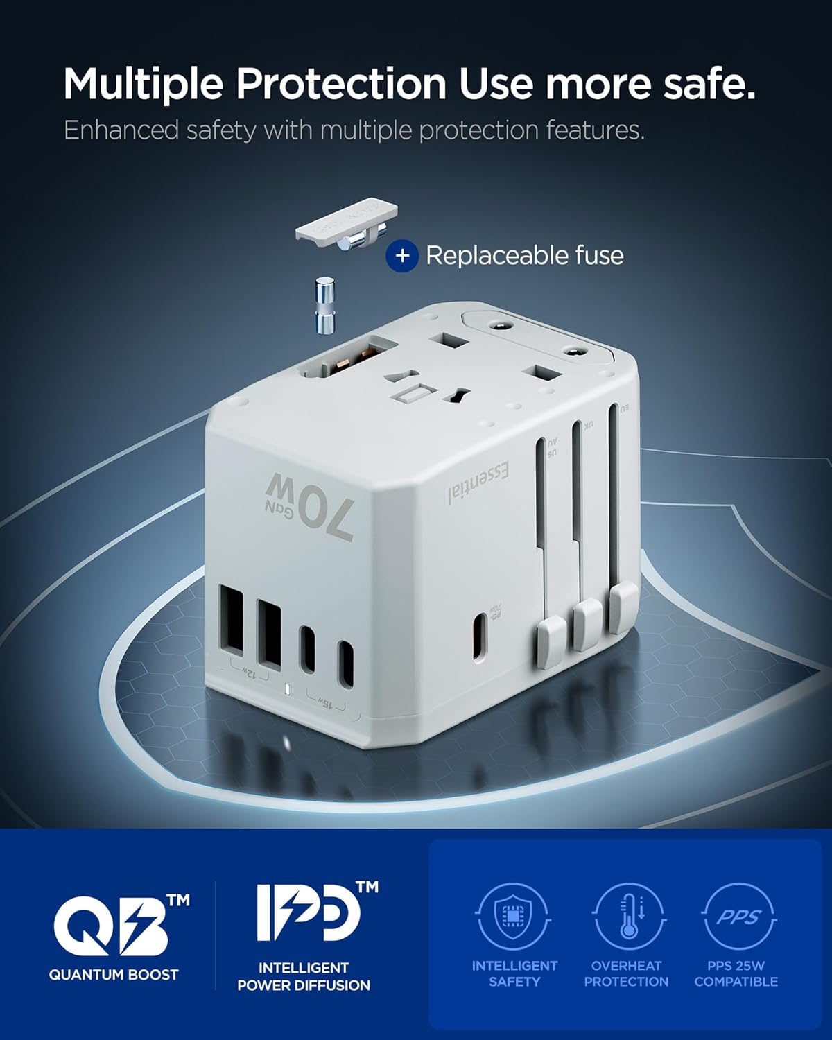 All-in-One Global Compatibility: Equipped with 4 interchangeable plugs (EU, UK, US, AU). Seamless connectivity in over 200 countries—perfect for vacations, business trips, or everyday international travel.