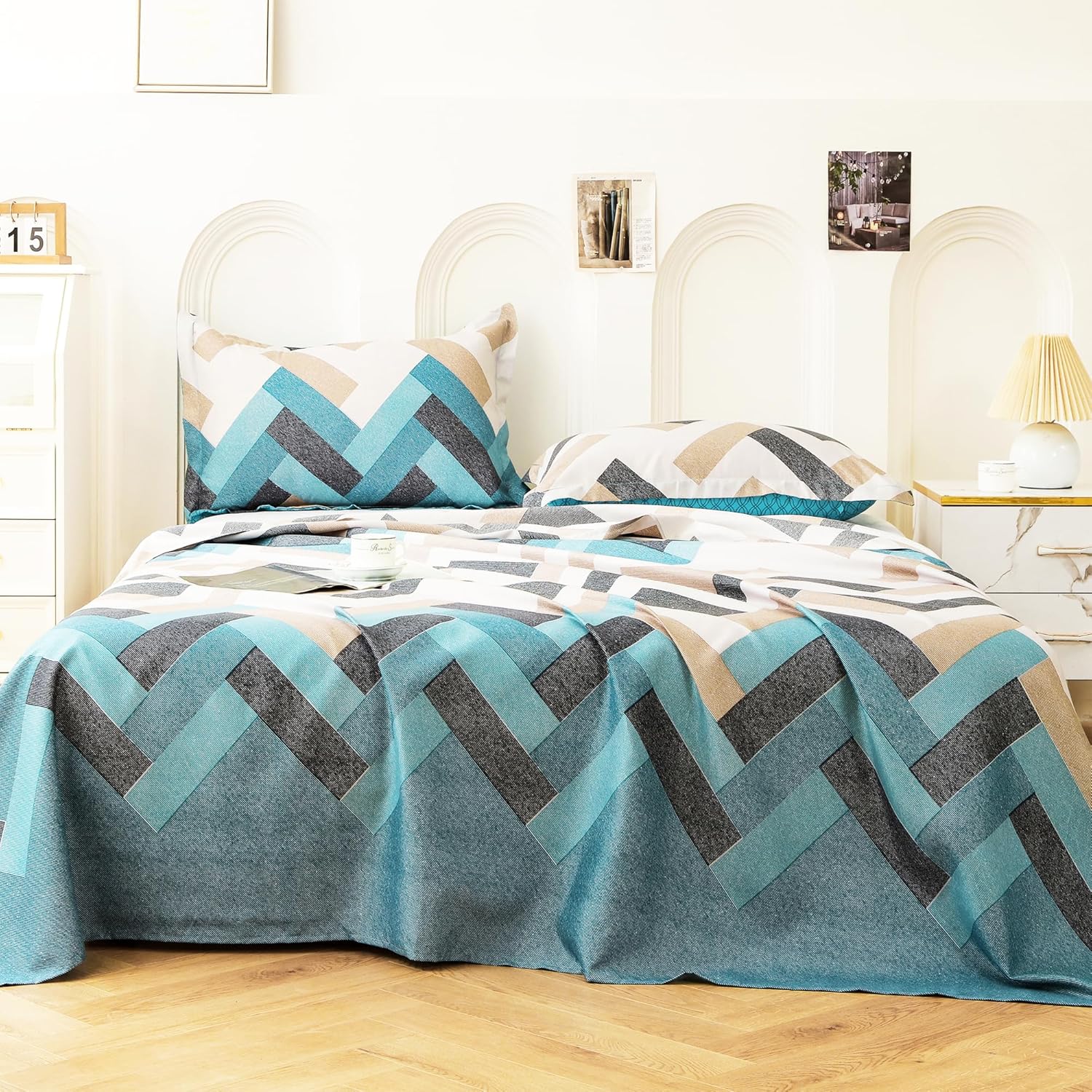 Add a stylish touch to your bedroom with this Aztec-patterned bedsheet and pillow cover set. Its perfect for contemporary bedrooms, instantly uplifting the overall look of your space. striking This King Size Bedsheet makes it an eye-catching addition to any decor! Featuring a modern geometric pattern in refreshing Cyan Blue and White, this bedsheet set adds a vibrant and sophisticated charm to your interiors.