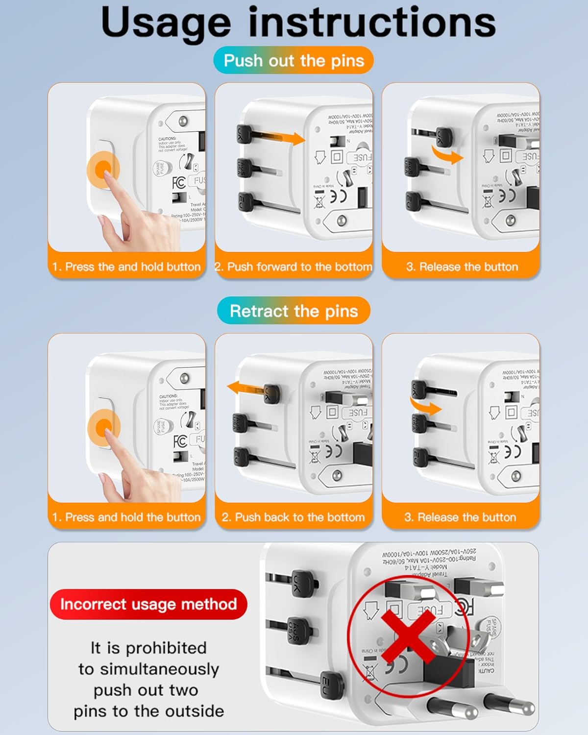 2500W High Power Travel Plug for Heavy Devices: Equipped with 2500W high power output, this international adapter can safely support high-consumption appliances like hair dryers, kettles, irons, and kitchen devices. Delivers stable, reliable performance for home, office and global travel use.