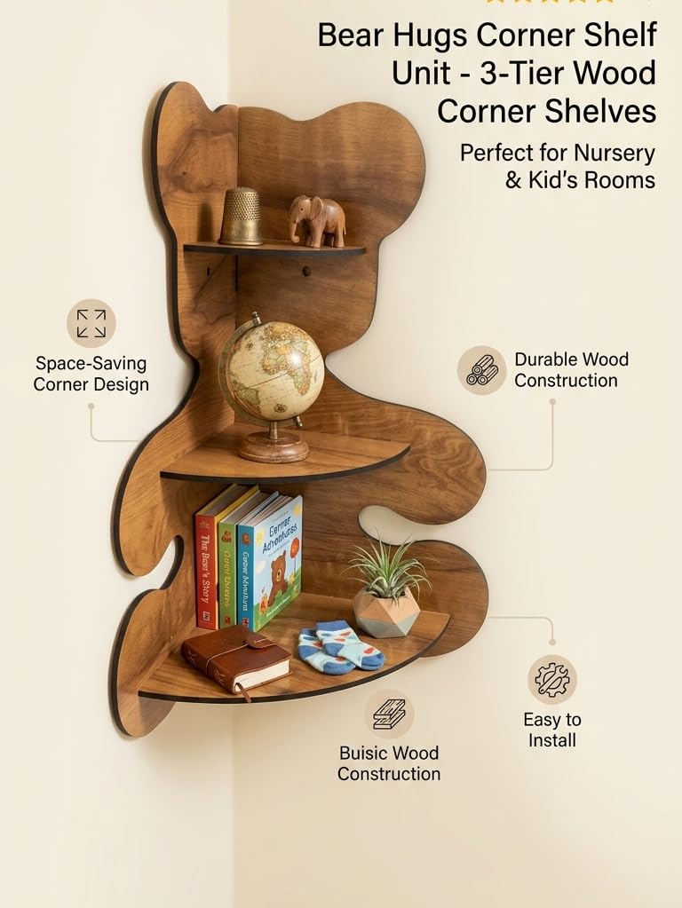 Wooden Corner wall Shelf for Living Room & Kids Bedroom,Stylish Teddy Bear Shape Stand for Book & Home Decoration Rack for Storage,Office Corner Decoration Items,Floating Wall Shelves