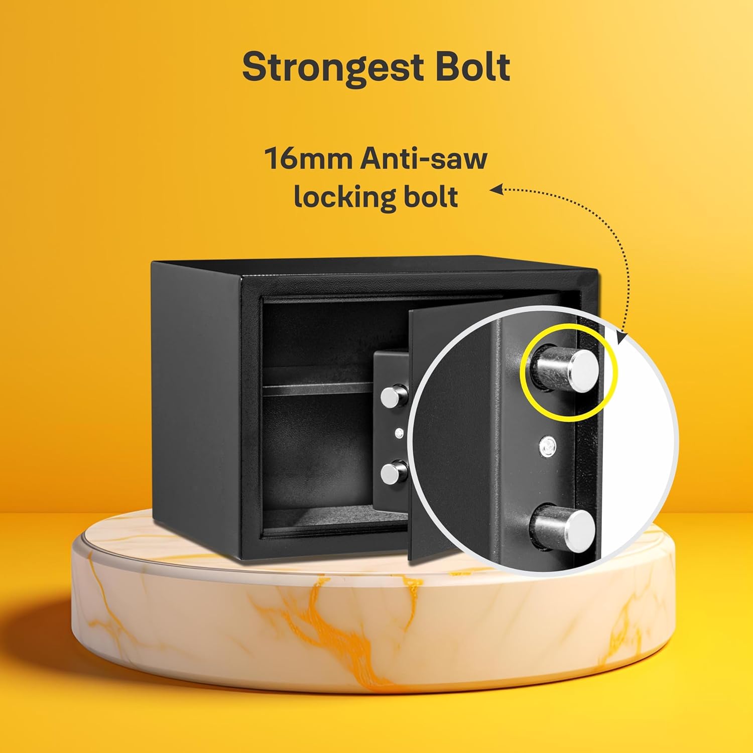 Total peace of mind : The safe comes with two anti-saw locking bolts (16mm) and with steel body for protection against all attacks; Technical details – Volume: 16.3 litres.